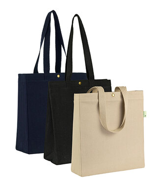 Description: Eco tote made from 12oz Recycled Cotton/R-Pet with long cotton webbing handles and an antique brass popper.