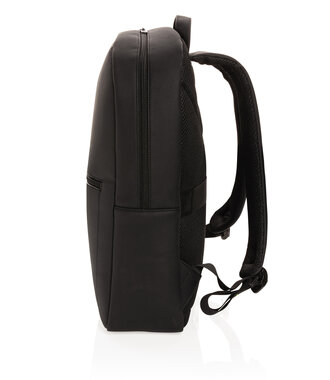 Description: A structured backpack made with soft PU in a clean and sleek style with tonal zippers. The backpack features a top zip closure, top carrying handle, adjustable shoulder straps, external zip pocket, interior zip pocket, luggage strap and a 15.6 inch laptop pocket.