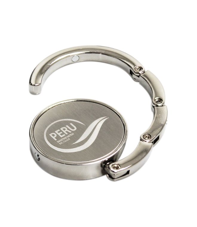 Description: Curved shiny silver chain unfolds to securely hold bag from table keeping it off the floor. Brushed matt silver finish centre ideal for engraving with rubber base on reverse. Presented in a 2 part lidded box.