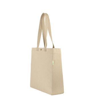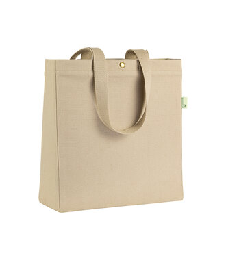 Description: Eco tote made from 12oz Recycled Cotton/R-Pet with long cotton webbing handles and an antique brass popper.