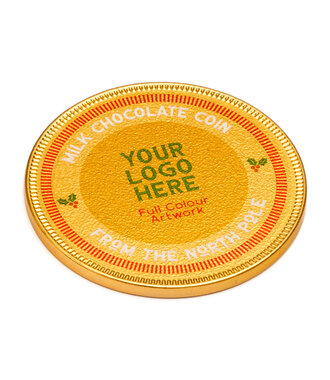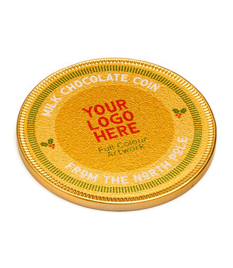 Description: A 75 mm gold foil wrapped chocolate medallion. Branded with a full colour clear vinyl sticker to one side.