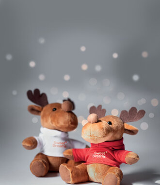 Description: Soft plush reindeer with removable hooded sweater that can be printed up to full colour with your chosen design.
