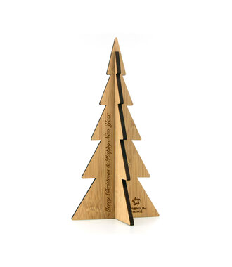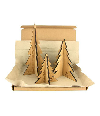 Description: 5mm thick bamboo flatpack Xmas tree. Available individually or as a gift set of three and posted in our eco plastic free packaging. For every 50 natural material products made, 1 tree will be planted; this truly is the gift that keeps on growing!
