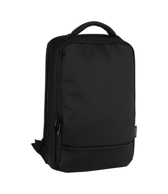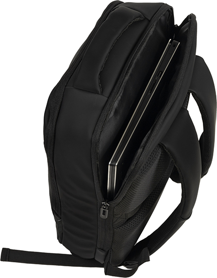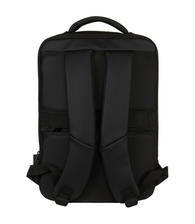 Description: Ideal for those with less to carry. Made from water resistant Recycled PU Includes front zipped compartment with organiser section, rear compartment with padding for 15.4" laptop, zipped safety pocket on rear. Deluxe padded back with padded top handle and adjustable back straps. Rear trolley strap.