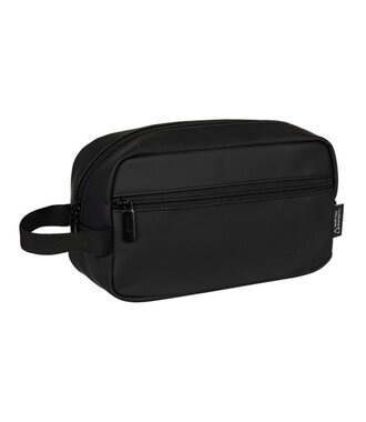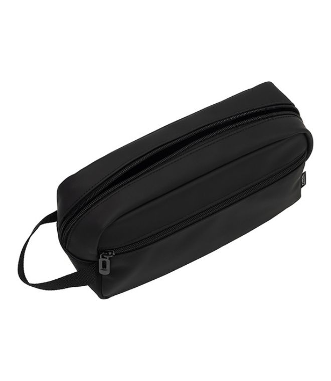 Description: A stylish washbag made from water resistant Recycled PU /210d R-Pet lining. Front zipped pocket, main zipped compartment has a divider. Handy side carry handle